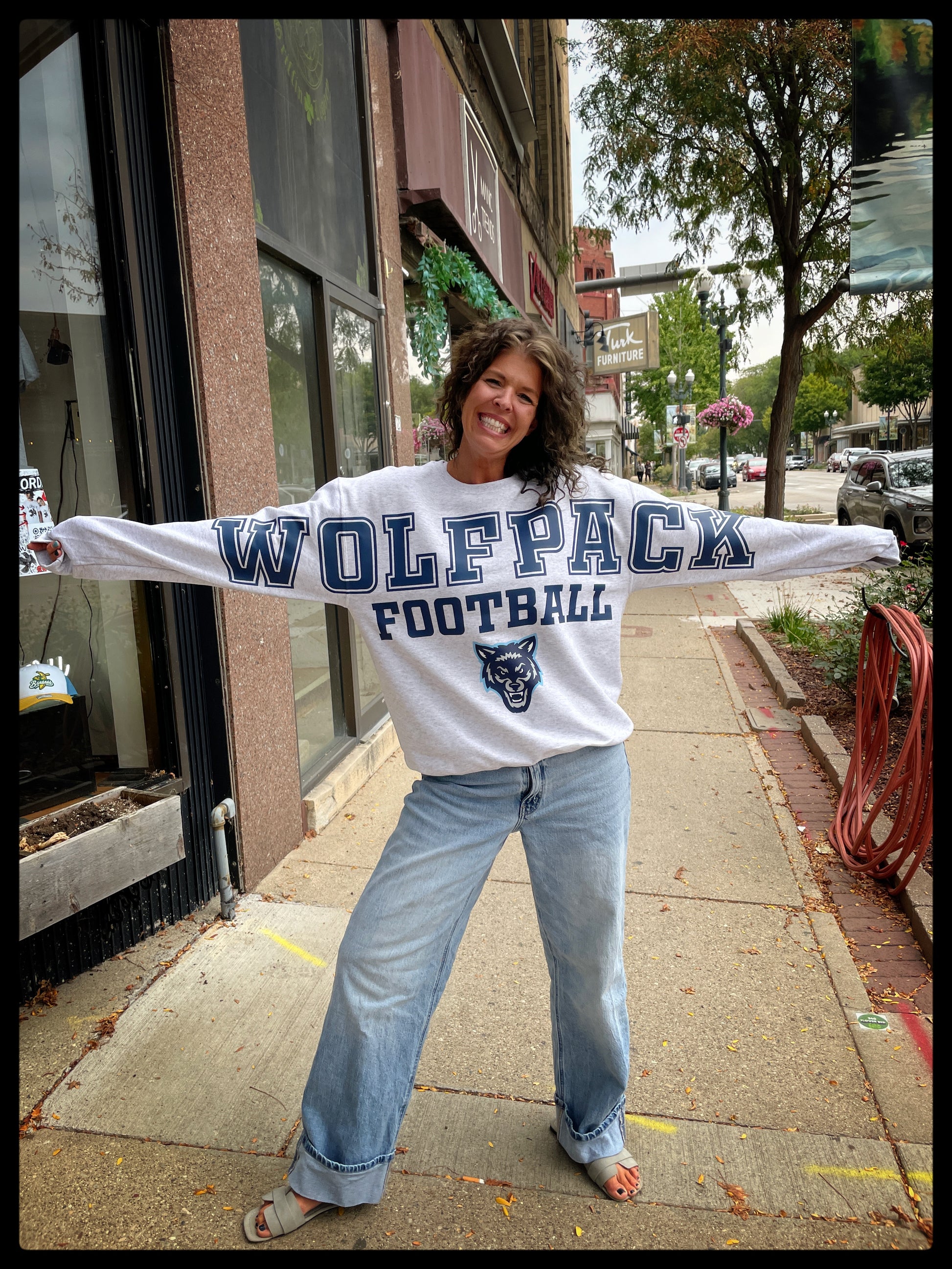 Show off your team pride in style and comfort with our Wolfpack Football oversized crewneck sweatshirt. Made from a soft cotton-blend fleece, this sweatshirt features bold WOLFPACK FOOTBALL lettering across the chest with the fierce Wolfpack mascot front and center.